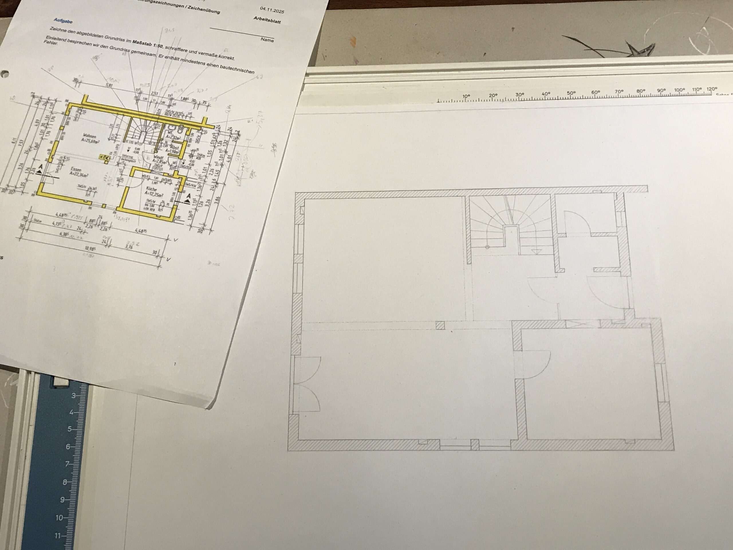 Da mein erstes Ausbildungsjahr überwiegend schulisch stattfindet, habe ich an vier Tagen in der Woche Berufsschule und so spannende Fächer wie Mauern, Handzeichnen und Zimmern. Ich arbeite also echt mit Mauersteinen, Mörtel, Holz und allem Werkzeug, was man zur Bearbeitung braucht. Und ich zeichne total oldschool auf einer Zeichenplatte mit Geodreieck, Lineal und verschiedenen Bleistiften. Computeranwendung mit Word, Excel und „Maschineschreiben“ gehört auch noch zu dieser Art der Ausbildung, ist aber überwiegend nichts Neues für mich. Alles andere schon. (Okay, mit zehn Fingern schreiben kann ich zwar nicht, schreibe aber trotzdem sau schnell durch die jahrelange Übung, was zum Glück auch zählt.)